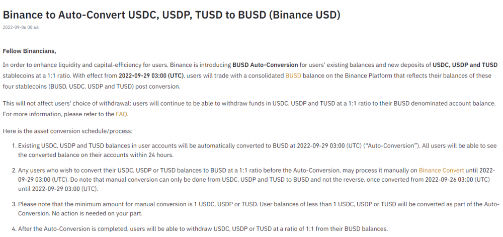Любые пользователи, которые все еще будут держать любые из этих трех стейблкоинов на 29 сентября, увидят автоматическую конвертацию своих активов в BUSD в соотношении 1:1 в течение 24-часового периода.