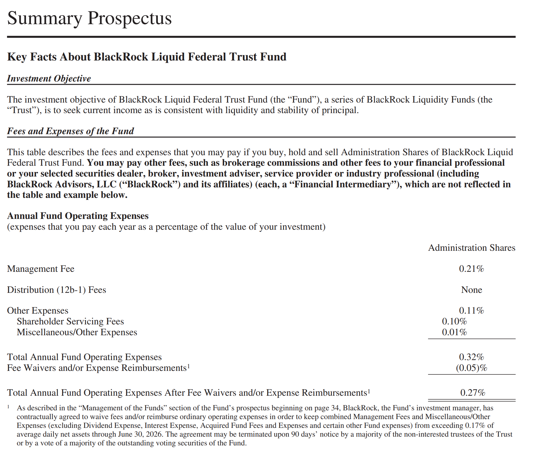 В кратком проспекте BlackRock опубликовала разбивку комиссий и операционных расходов фонда, включая комиссию за управление в размере 0,21%, комиссию за обслуживание акционеров в размере 0,10% и общие расходы в размере 0,27% после освобождения от уплаты комиссий. Также было указано, что соглашение об освобождении от уплаты комиссий действует до 30 июня 2026 года.
