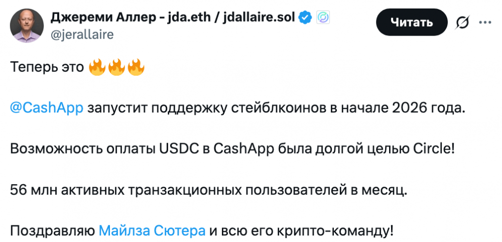 Хотя приложение не уточнило, какие именно стейблкоины могут быть доступны для транзакций, крупнейшими по рыночной капитализации являются Tether (USDT) и USD Coin (USDC) от Circle. Генеральный директор Circle Джереми Аллер положительно оценил это решение, намекнув, что ожидает использования стейблкоина своей компании для платежей в Cash App.