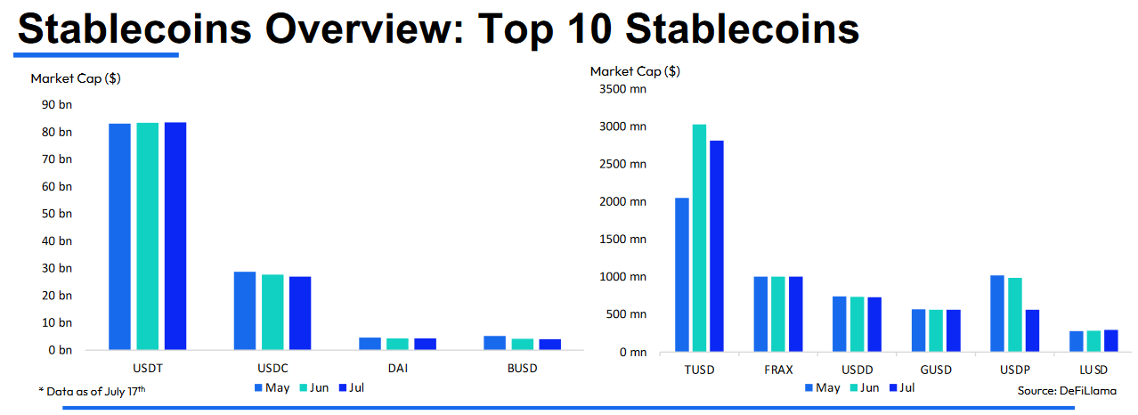 Доминирование на рынке стейблкоинов немного снизилось и в настоящее время составляет 10,3% по сравнению с 10,5% в июне.