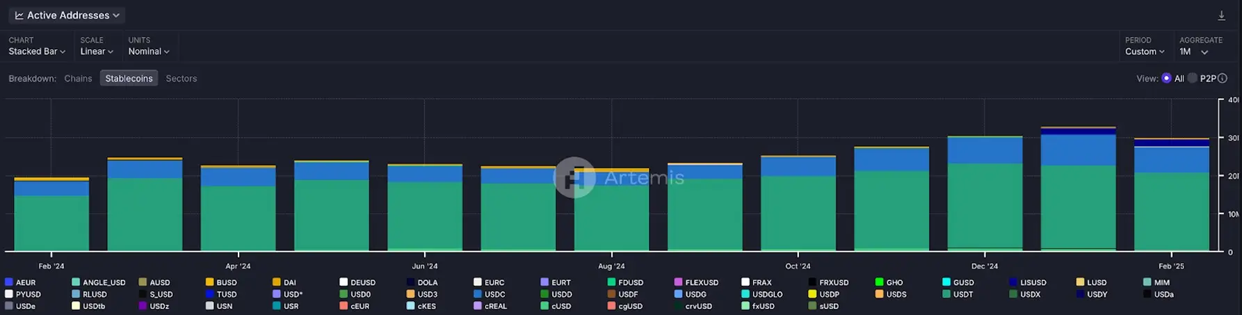 Активные адреса стейблкоинов с февраля 2024 года по февраль 2025 года. Источник: Artemis.