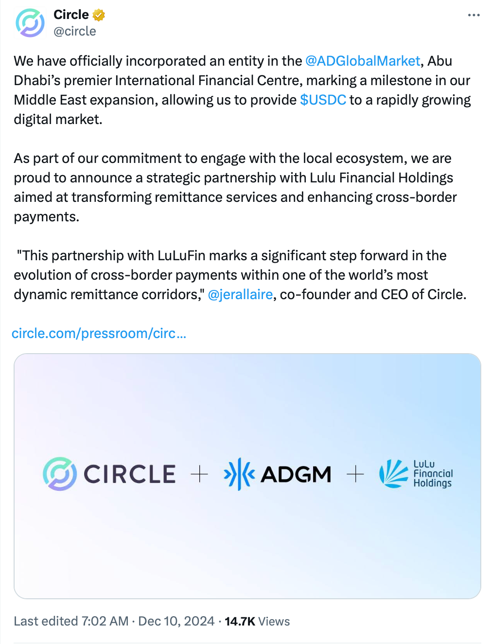 Circle заключила партнерство с LuLu Financial Holdings и ее филиалами для упрощения денежных переводов и трансграничных платежей с использованием USDC. LuLu Financial ежегодно управляет транзакциями на сумму более 10 миллиардов долларов, работая в государствах-членах Совета сотрудничества арабских государств Персидского залива, на Индийском субконтиненте и в Азиатско-Тихоокеанском регионе.