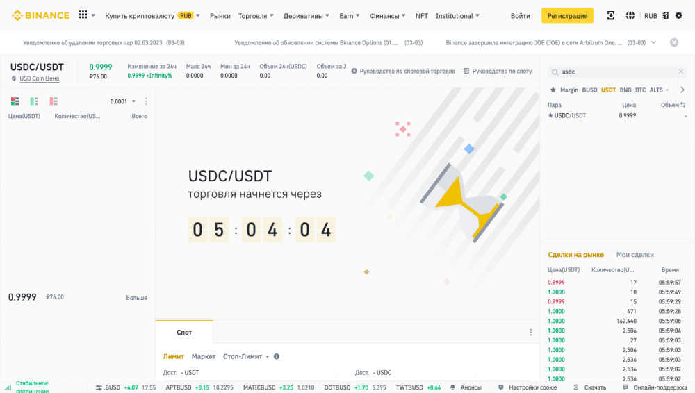 На сайте биржи видно, что торговля в абитражной паре USDC/USDT также остановлена до момента открытия банков в США.