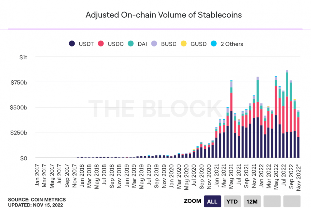 На USDT и USDC приходится наибольшая доля объема стейблкоинов: в этом месяце они составили 205 и 195 миллиардов долларов соответственно. Скорректированный объем стейблкоинов в сети в ноябре составляет 473 миллиарда долларов, что означает, что USDT и USDC составляют более 60% от общего объема.