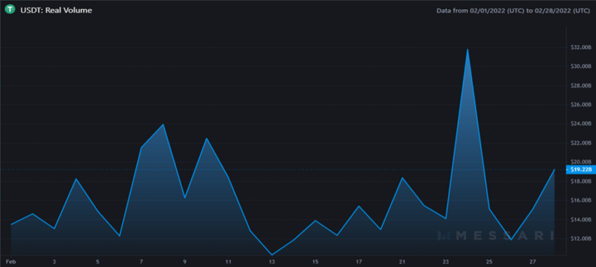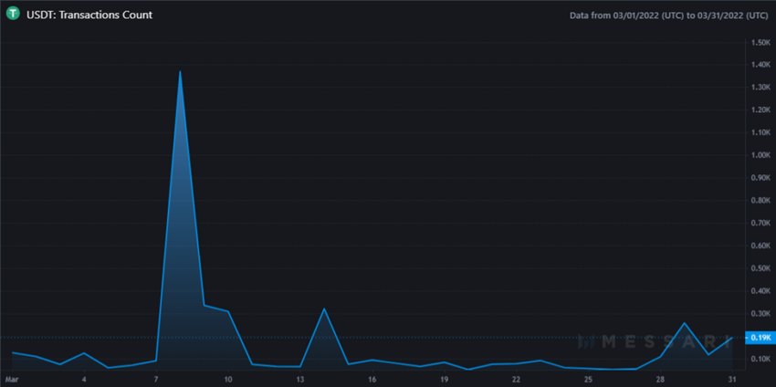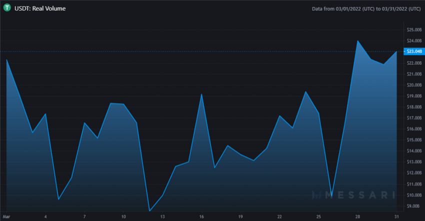 Tether (USDT) испытал небольшое увеличение реального объема торгов в марте, но с 2021 года он упал более чем на 500 миллиардов долларов.