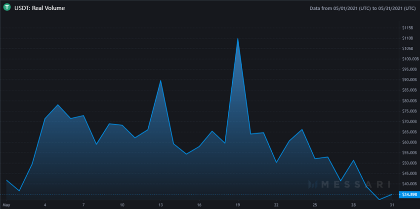В первые две недели мая 2021 года наблюдался рост спроса инвесторов на цифровые активы, что впоследствии привело к новым ценовым вехам для нескольких монет. В последние две недели месяца также наблюдалось медвежье поглощение, которое также привело к падению цен на токены, в результате чего реальный объем USDT составил 1,84 триллиона долларов.