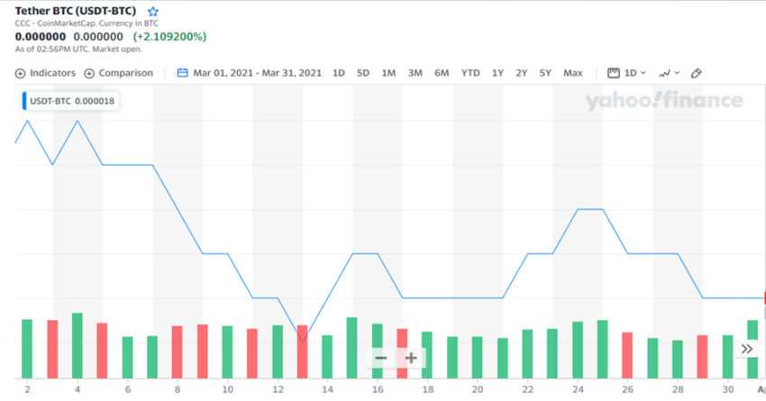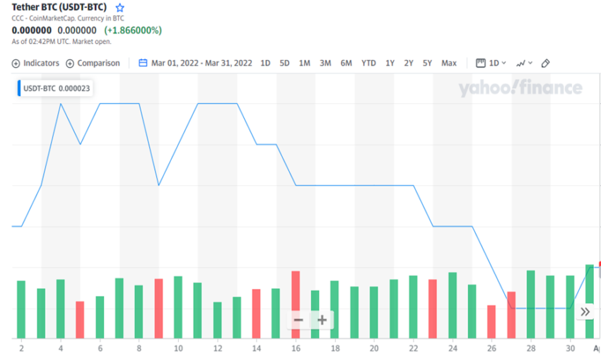 В прошлом месяце годовое снижение реального объема отразилось на объеме торгов USDT/BTC, который составил около 45 миллионов долларов по сравнению с мартом 2021 года.