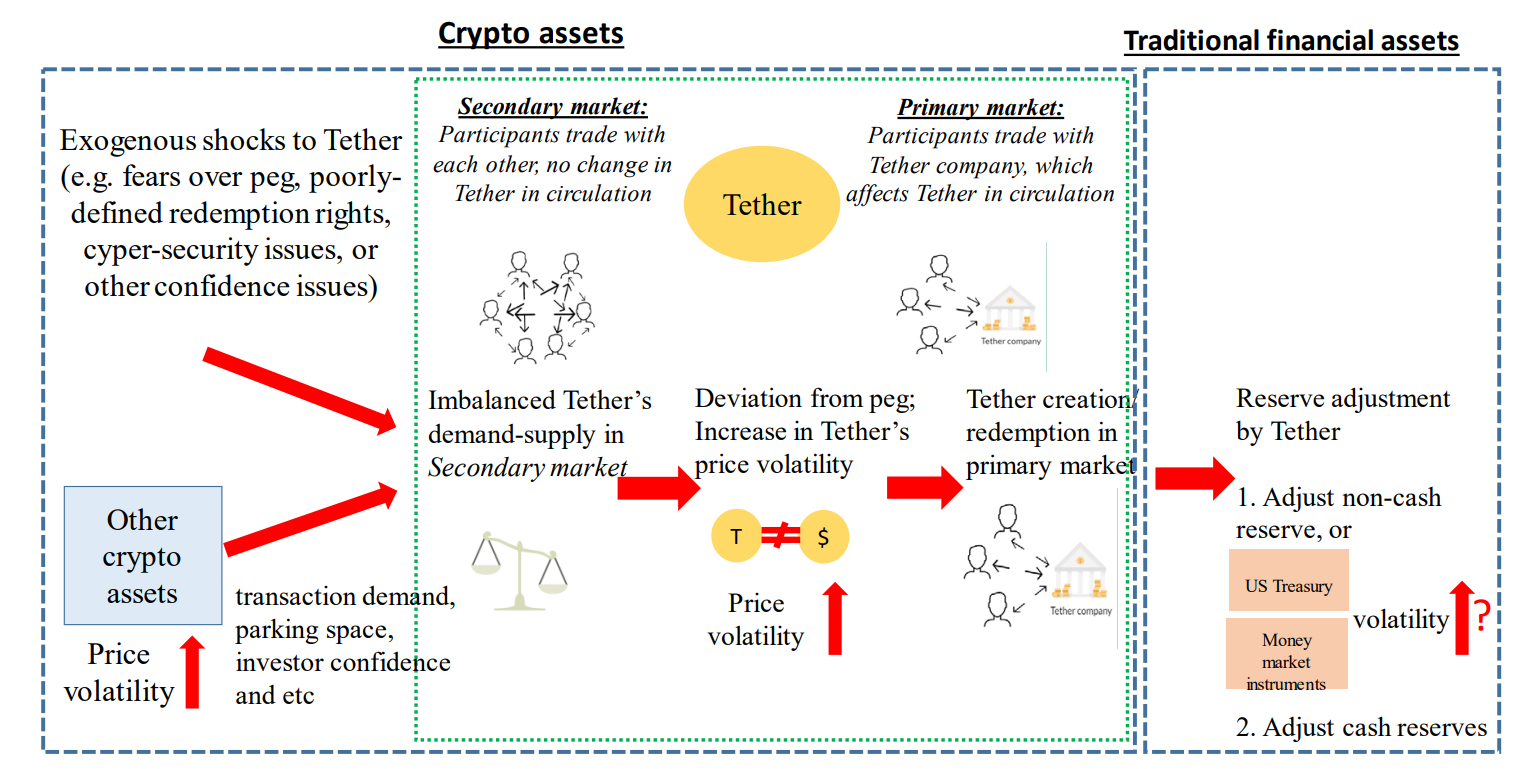 Иллюстрация механизма транзакций Tether и канала распространения от крипторынка к традиционным финансовым активам. Источник: HKMA.