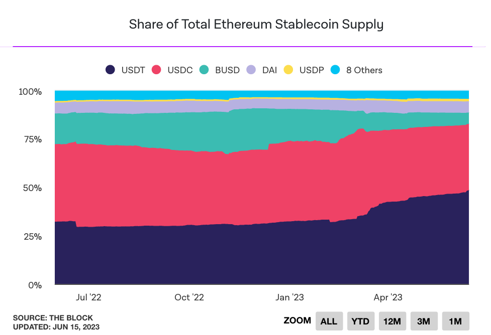 Действительно, BUSD также теряет свою долю в общем объеме стейблкоинов Ethereum с марта этого года, как показывают данные The Block, поскольку USDT и USDC усиливают свое доминирование.