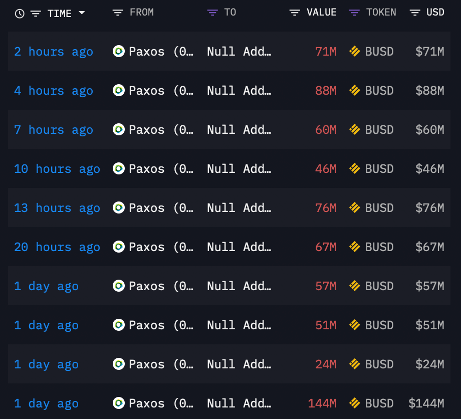 Paxos прекратила выпуск BUSD, но продолжает выполнять погашения. По меньшей мере 1 млрд BUSD был сожжен в обмен на погашение в долларах США, как показывают данные сети.