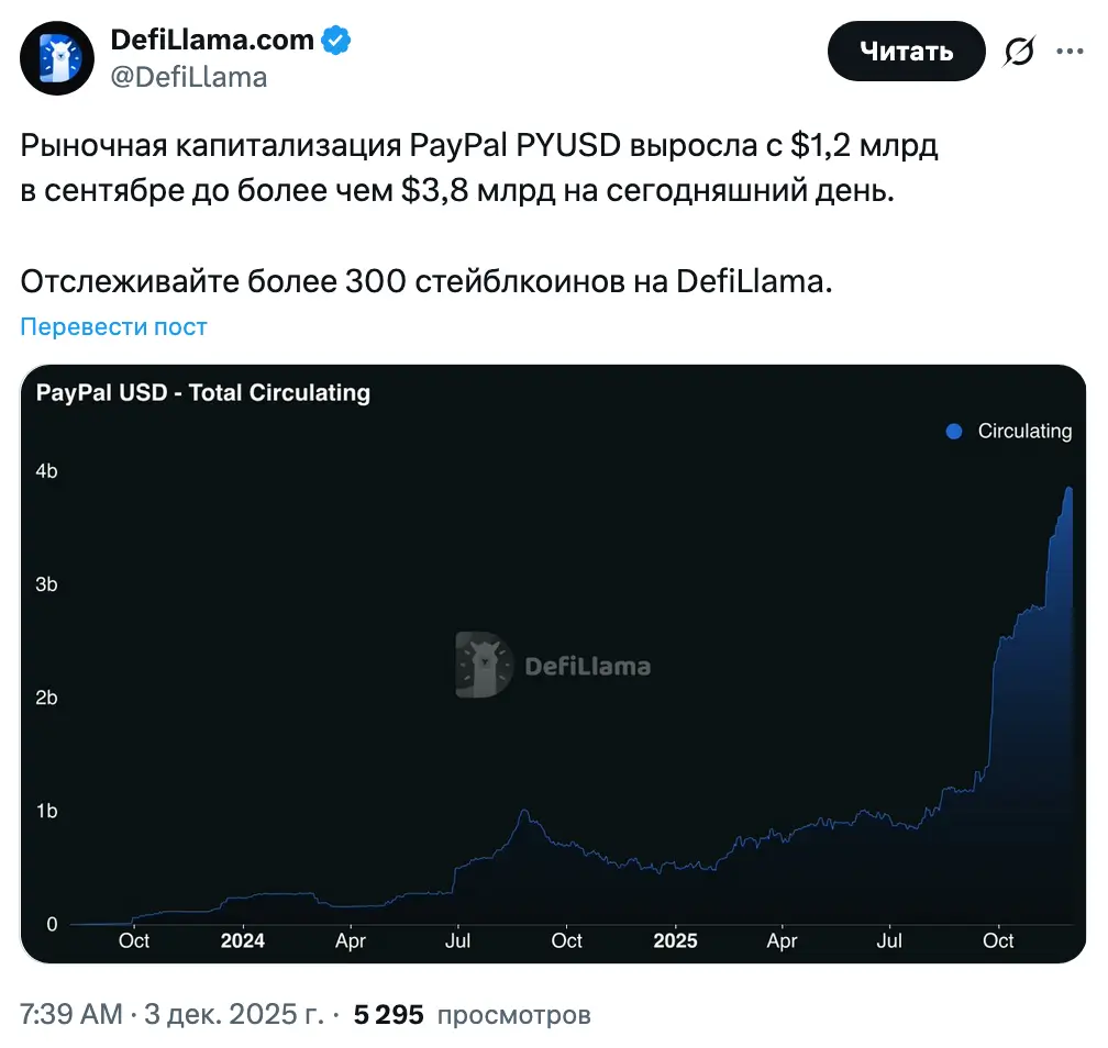 Согласно данным DeFiLlama, с сентября капитализация PYUSD выросла более чем на 216% — с $1,2 млрд до $3,8 млрд. За три месяца показатель увеличился на $2,6 млрд.