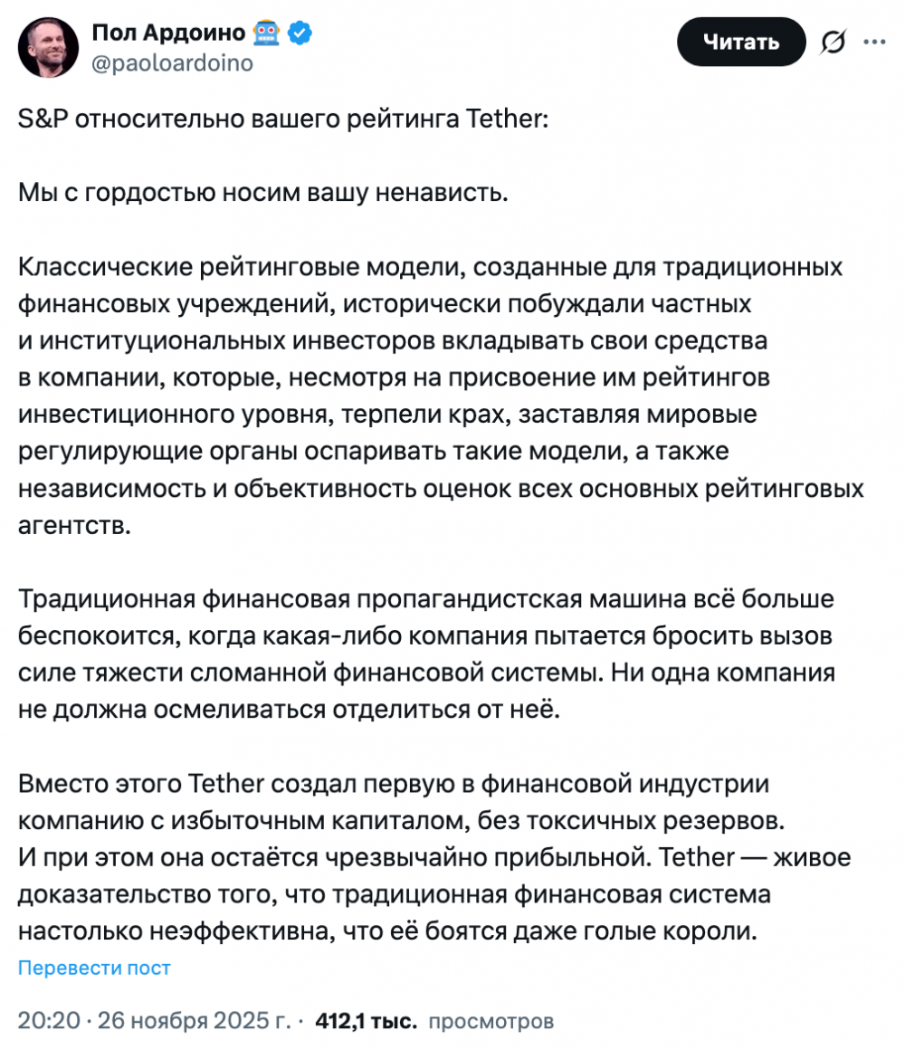 Генеральный директор Tether Паоло Ардоино также выступил с критикой нового рейтинга и в целом полезности рейтинговых агентств.