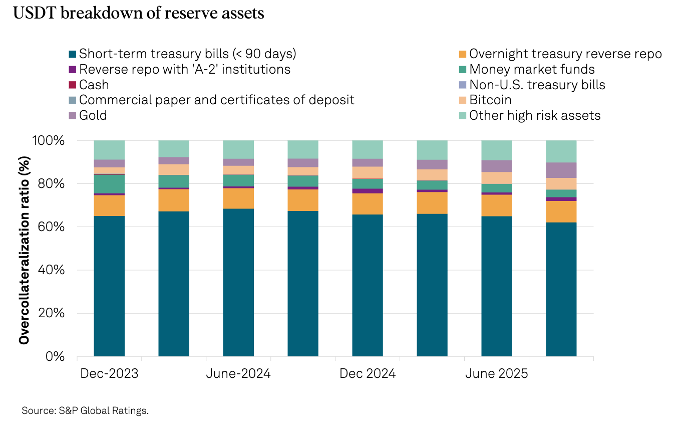 Оценка «слабая» была вынесена по ряду причин. В частности, S&P Global отметило, что обеспечение USDT включает золото, займы и корпоративные облигации, подверженные высокой волатильности. В отчете указано:
