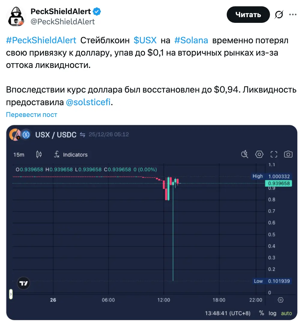 В пятницу в публикации на платформе X сервис PeckShieldAlert сообщил, что USX временно торговался по цене всего $0,10 на вторичных рынках, прежде чем восстановиться. Такое падение объяснили отдельными сделками, совершенными в период крайне низкой ликвидности.
