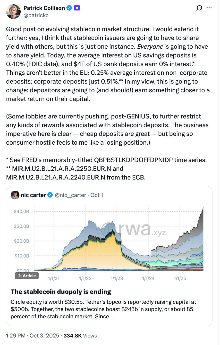 По словам Патрика Коллисона, генерального директора платежной компании Stripe, стейблкоины, токенизированные версии фиатных валют, работающие на основе блокчейна, в конечном итоге вынудят банки и другие финансовые учреждения предлагать клиентам доходность по депозитам для сохранения конкурентоспособности.