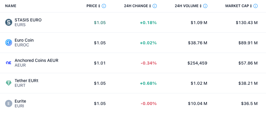 По данным Crypto.com, евро-стейблкоины — это рынок стоимостью 367 миллионов долларов на момент написания статьи, причем Stasis Euro (EURS) и Euro Coin (EURC) представляют собой крупнейшие стейблкоины с рыночной капитализацией 130 миллионов и 90 миллионов долларов соответственно.