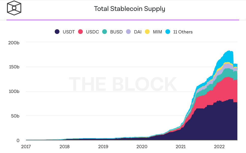 В то время как у Tether есть несколько стейблкоинов с привязкой к фиату, его стейблкоин USDT, номинированный в долларах США. остается самым популярным, хотя в последнее время на фоне паники по поводу краха алгоритмического стейблкоина terraUSD (UST) и общего спада рынка в нем наблюдались значительные объемы погашения.