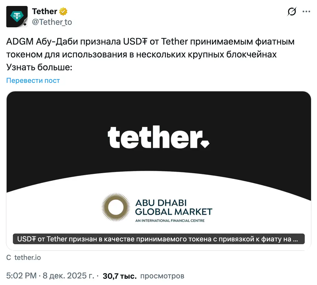 В понедельник было объявлено, что USDT официально получил статус «допустимого токена, привязанного к фиатной валюте». Это дает право регулируемым компаниям в Международном финансовом центре Абу‑Даби (ADGM) предоставлять услуги торговли, хранения и иные сервисы с использованием этого стейблкоина.