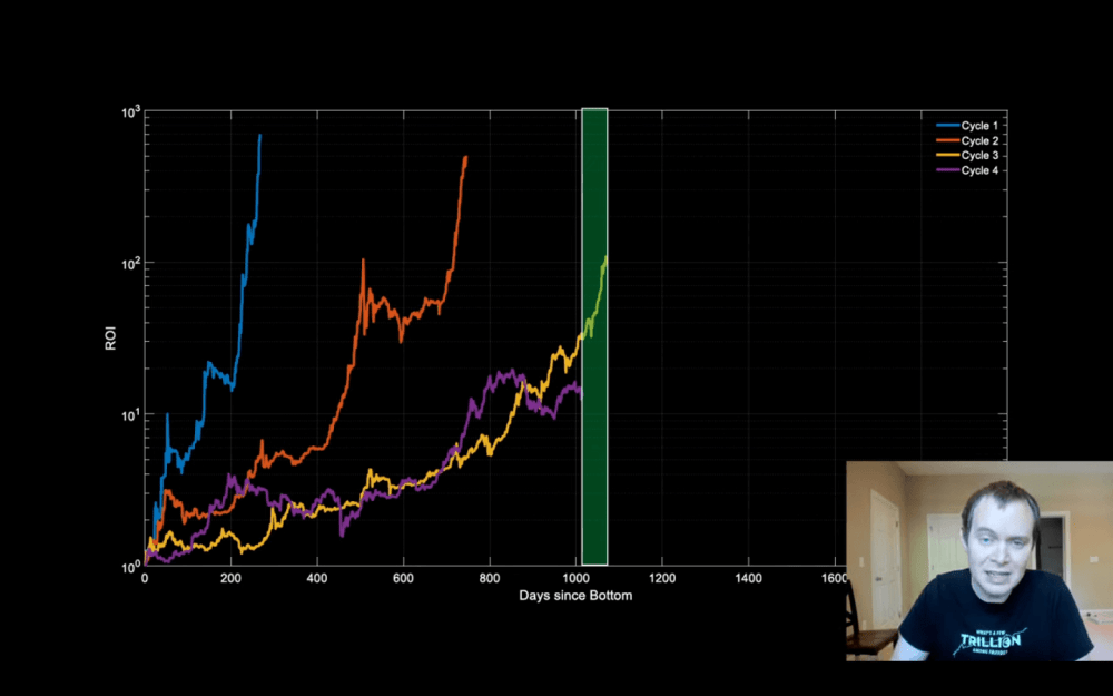 «Мы смотрели на этот график много лет назад, и наши предположения заключались в двух вещах… Во-первых, мы ожидали, что у нас будет убывающая прибыль. Во-вторых, мы ожидаем, что у нас будут циклы удлинения. Эти две теории не исключают друг друга, вы можете иметь одну без другой, и если 64 тысячи долларов в конечном итоге окажутся вершиной рыночного цикла, то вместо удлинения циклов у нас просто будет убывающая доходность», - предполагает Коуэн.