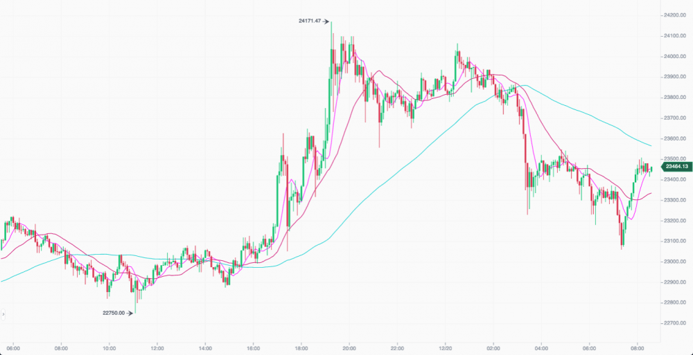 Цена на ведущую криптовалюту продолжила свой недавний бурный рост, установив новый рекордный максимум в 24122,67 доллара, прежде чем упасть до 23 435.02 доллара, что на +2% выше, чем день назад.