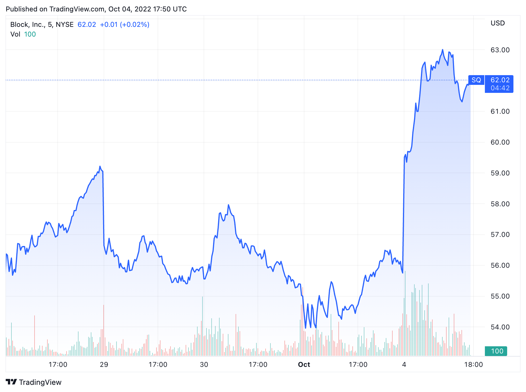 Block (SQ) Джека Дорси вырос более чем на 11% во вторник, торгуясь на уровне 62 долларов на момент написания, согласно данным Nasdaq в TradingView. Block показал скромные результаты в бурном третьем квартале 2022 года, торгуясь на уровне 67,02 доллара 5 июля и закрыв квартал в пятницу на уровне 54,99 доллара.