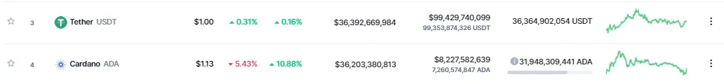 Из-за резкого падения Cardano потерял свое место в тройке лидеров списка криптовалют после биткоина и эфира. Стейблкоин Tether (USDT) заменил актив, опустив ADA на четвертую позицию.