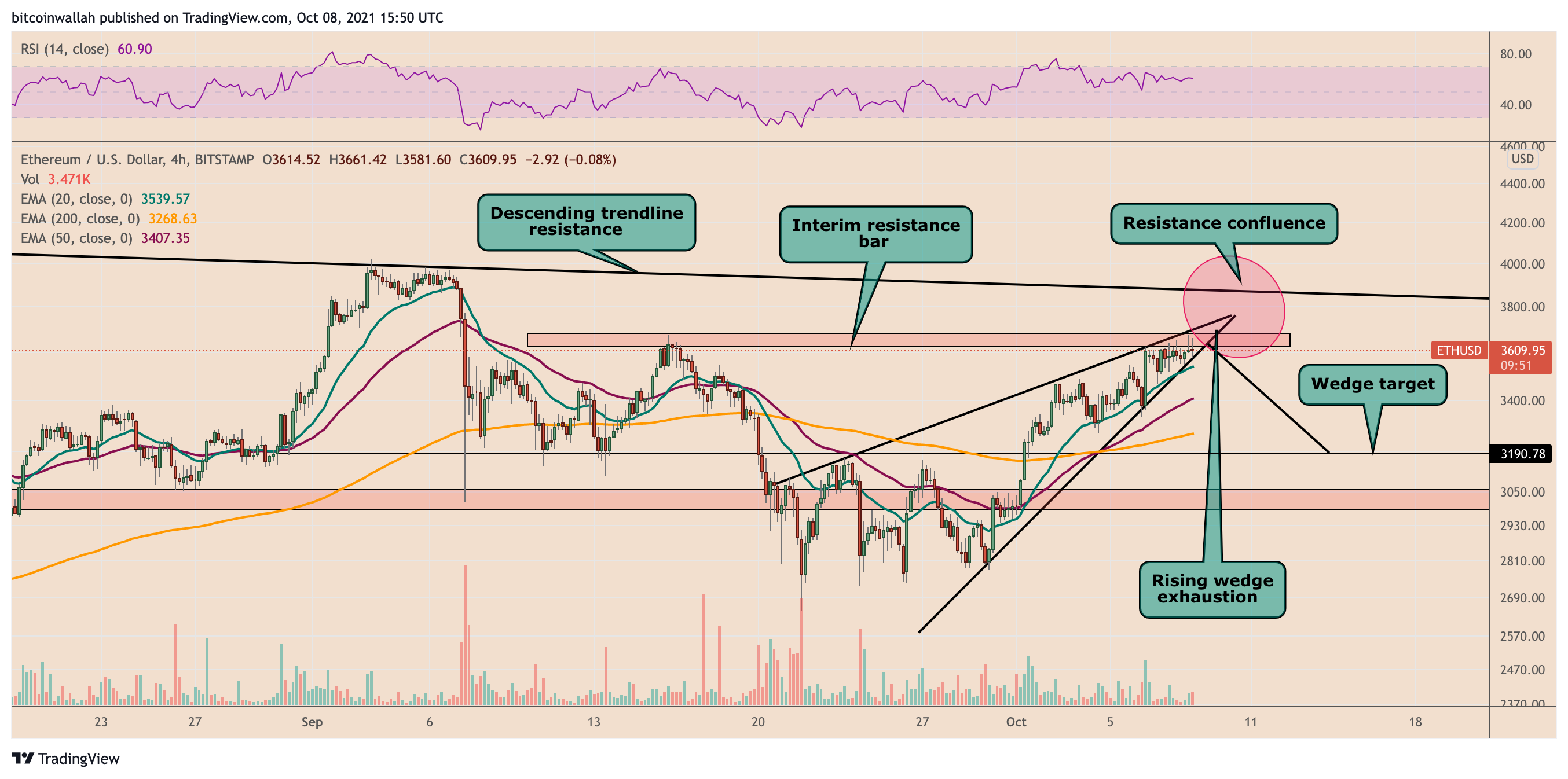 Кроме того, вершина структуры - точка, в которой сходятся две линии тренда - находится около двух исторических зон сопротивления. Первая - это временная полоса сопротивления, как показано на графике выше, которая ранее выявила вершину ETH выше 3650 долларов.