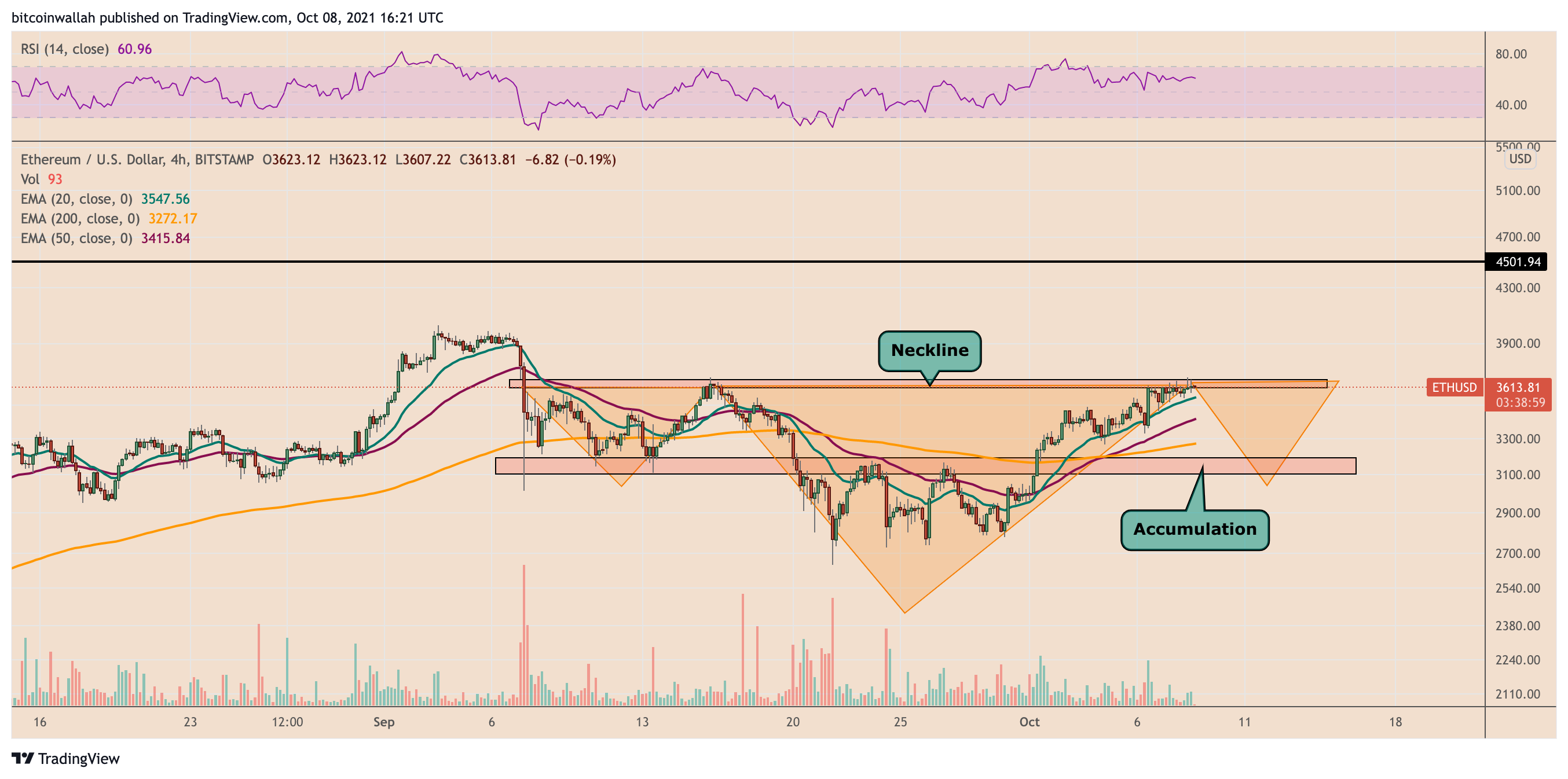 Ценовой график ETH/USD за 4 часа с потенциально перевернутой фигурой головы и плеч. Источник: TradingView.com