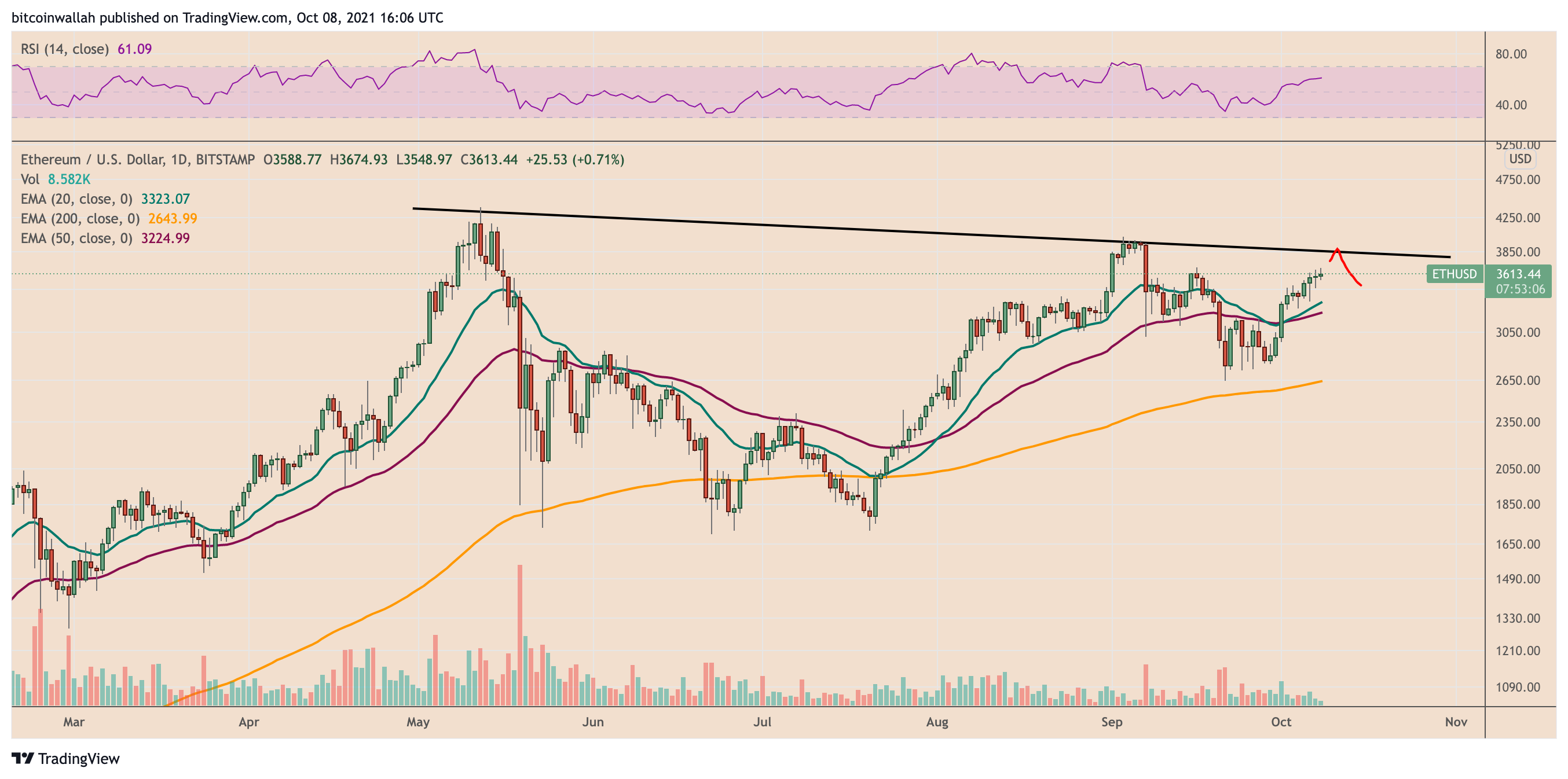В частности, цена ETH выросла почти на 22% за период с начала месяца до текущей даты после ценового ралли в масштабах всего рынка. Это подтолкнуло вторую по величине криптовалюту по рыночной капитализации с менее 3000 долларов до более 3650 долларов в первые восемь дней октября, вызвав больше оптимистичных прогнозов.