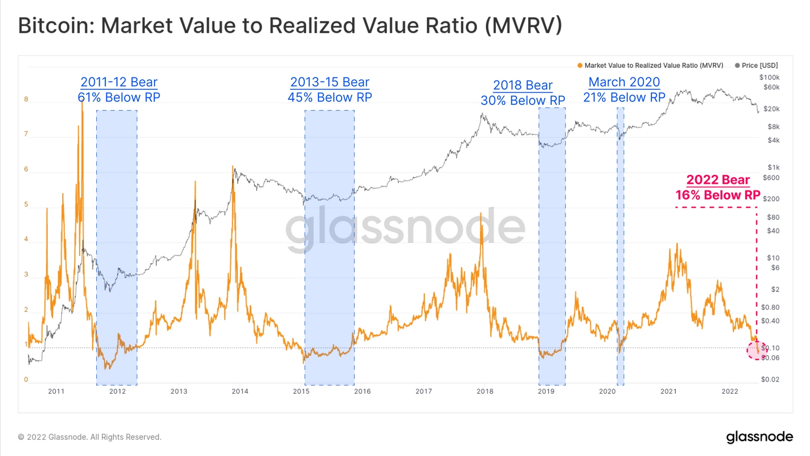 Glassnode отмечает, что случаи, когда спотовые цены торгуются ниже цены реализации, редки, отметив, что это только третий раз за последние шесть лет и пятый раз с момента запуска Биткойна в 2009 году: