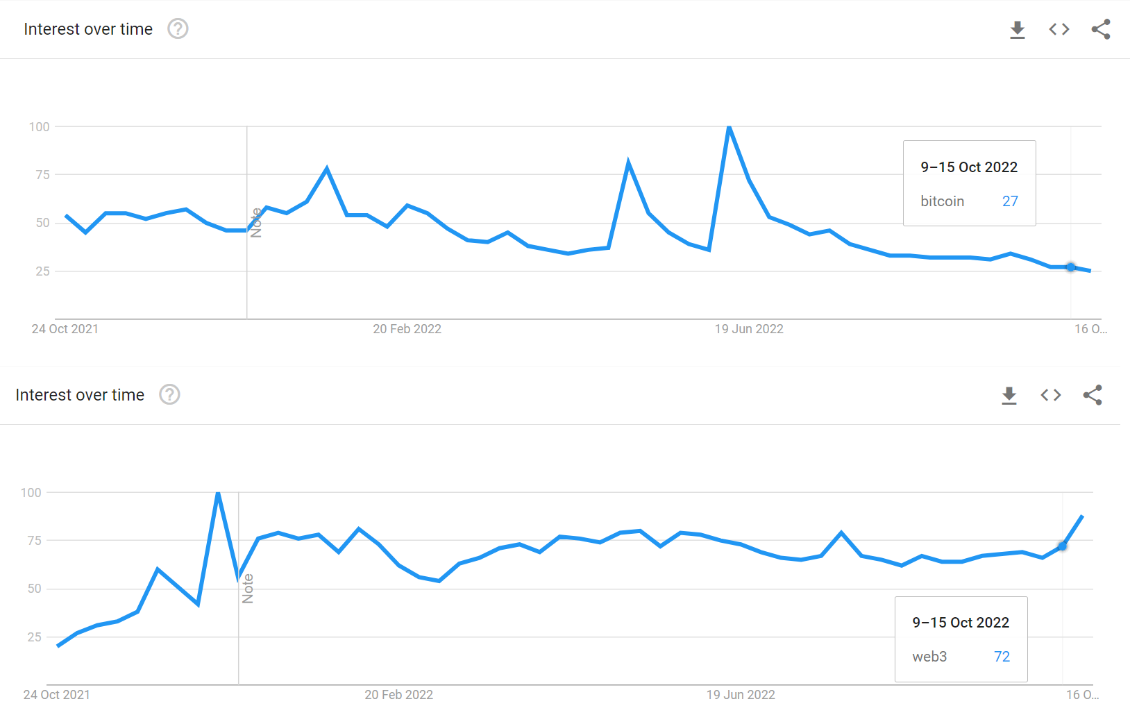 Результаты поиска Google для «биткоин» (вверху) и «Web3» (внизу). Источник: Google Trends.