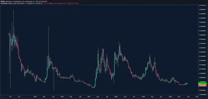 Криптовалютный трейдер @filbfilb обрисовал исторический график LTC/BTC, который показывает, что цена торгуется очень близко к своим абсолютным в истории минимумам.
