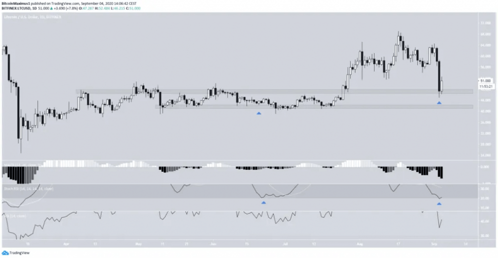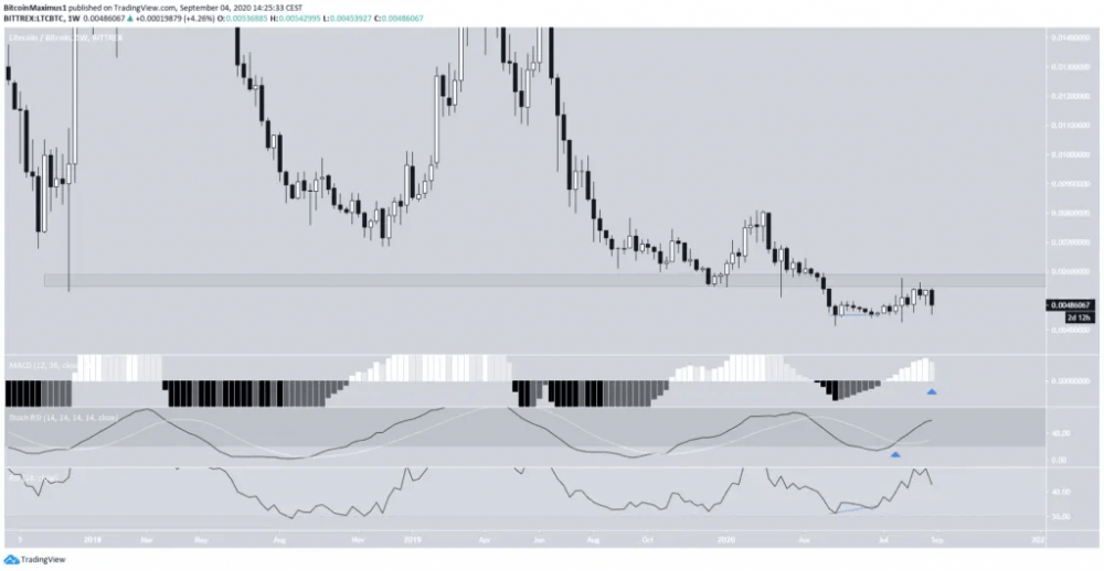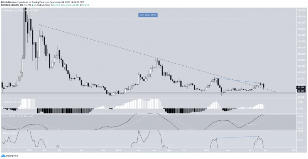 В начале июля цена LTC пробила нисходящую линию сопротивления, которая существовала 889 дней. Снижение на этой неделе послужило подтверждением того, что линия является поддержкой, что является обычным явлением после прорывов.