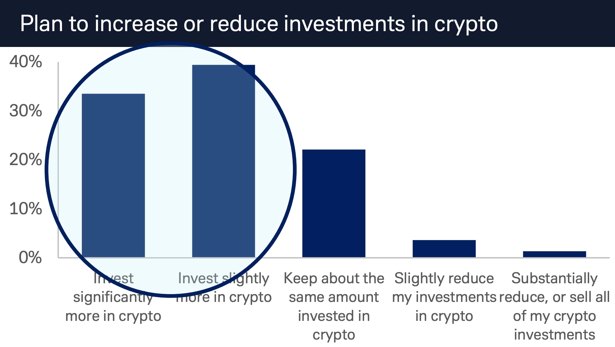 «Интересно отметить глубокий бычий настрой на криптовалюты. Даже на крайне медвежьем рынке криптовалют, на котором стоимость должна была упасть на 80%, менее половины инвесторов говорят, что сократят свои инвестиции или уйдут с рынка».
