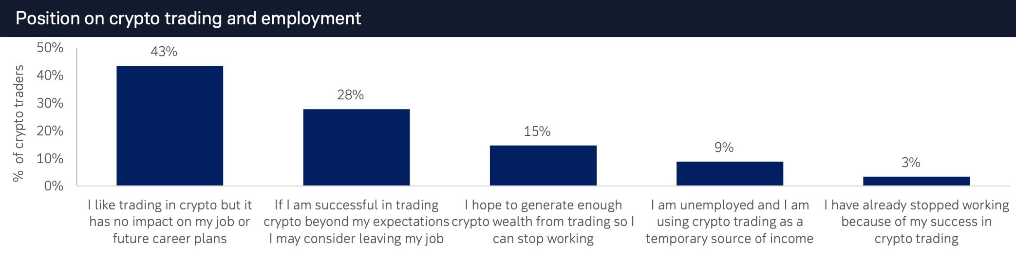 Даже на крайне медвежьем рынке криптовалют менее половины трейдеров (которые составляют более 35% опрошенных) заявили, что сократят свою торговлю. Кроме того, более 70% планируют увеличить (значительно или незначительно) свою криптоактивность в ближайшие шесть месяцев.