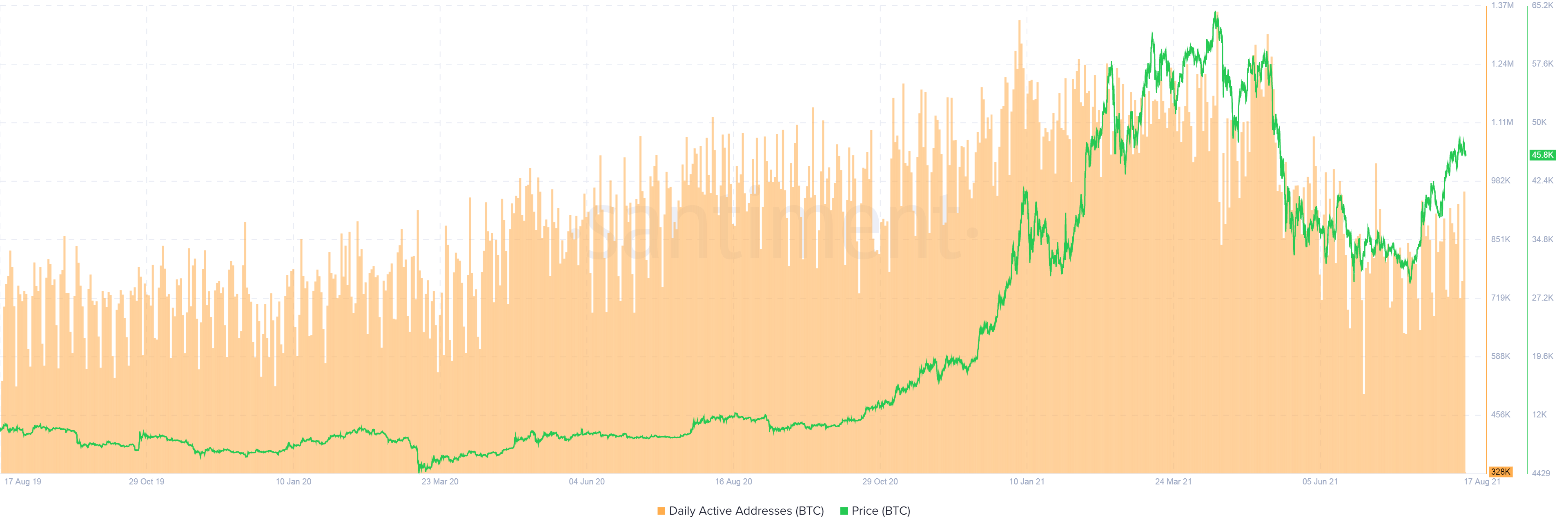 На момент публикации в сети 328 тысяч биткойн-адресов продемонстрировали некоторую активность, в то время как биткойн торгуется на уровне 45 700 долларов.