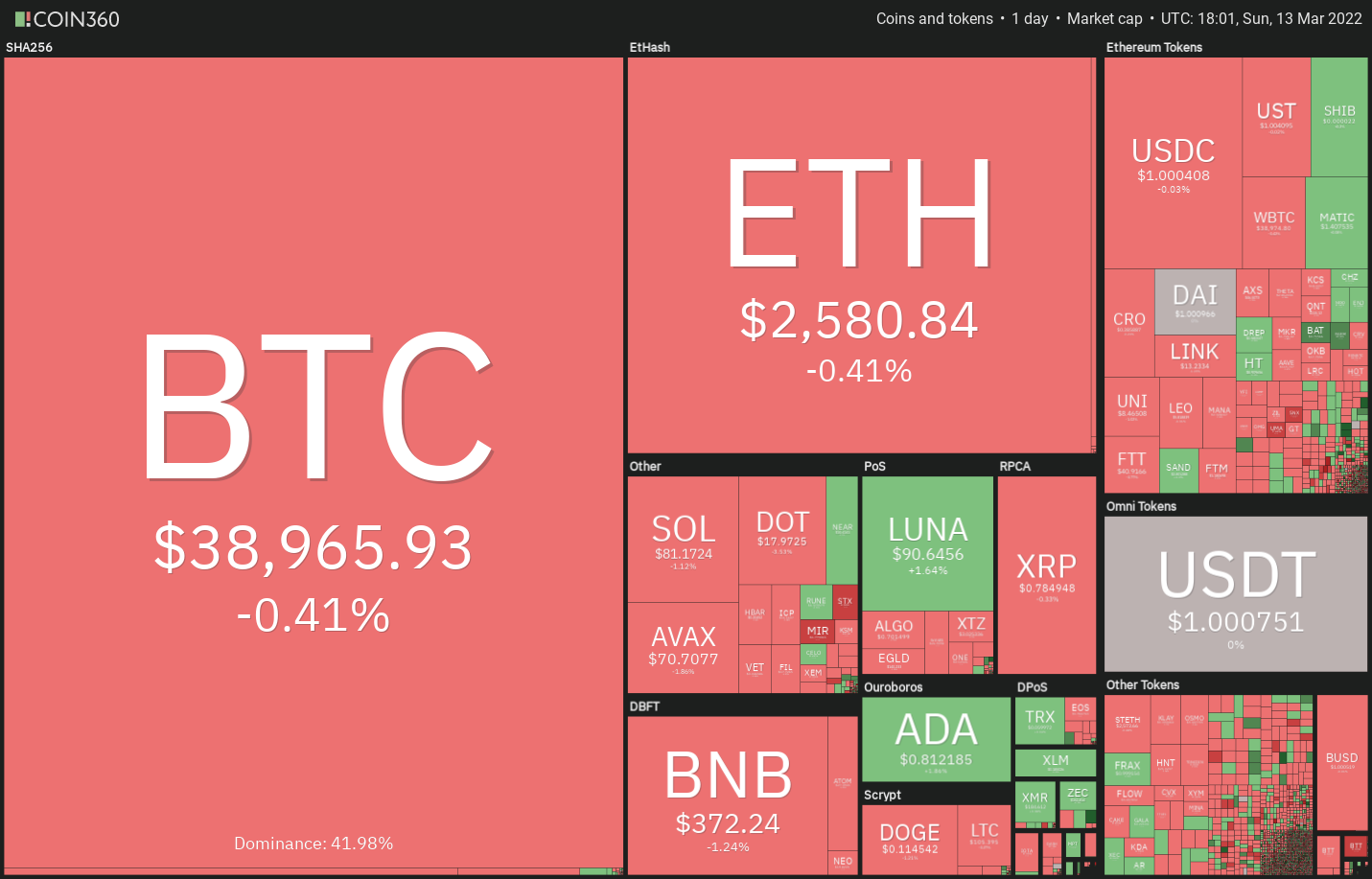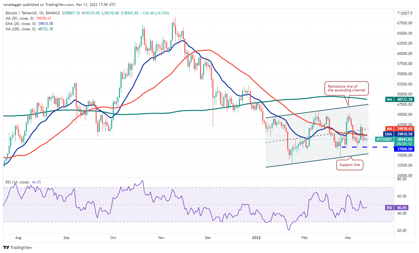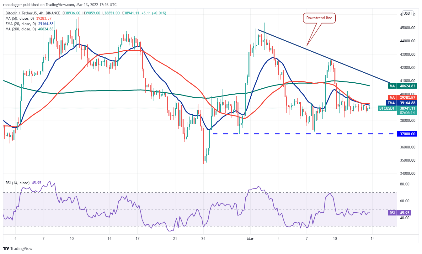 Биткойн сформировал свечной паттерн Доджи 12 и 13 марта, что указывает на нерешительность как быков, так и медведей. Цена застряла между 20-дневной экспоненциальной скользящей средней (EMA) на уровне 39 810 долларов и горизонтальной поддержкой на уровне 37 000 долларов.