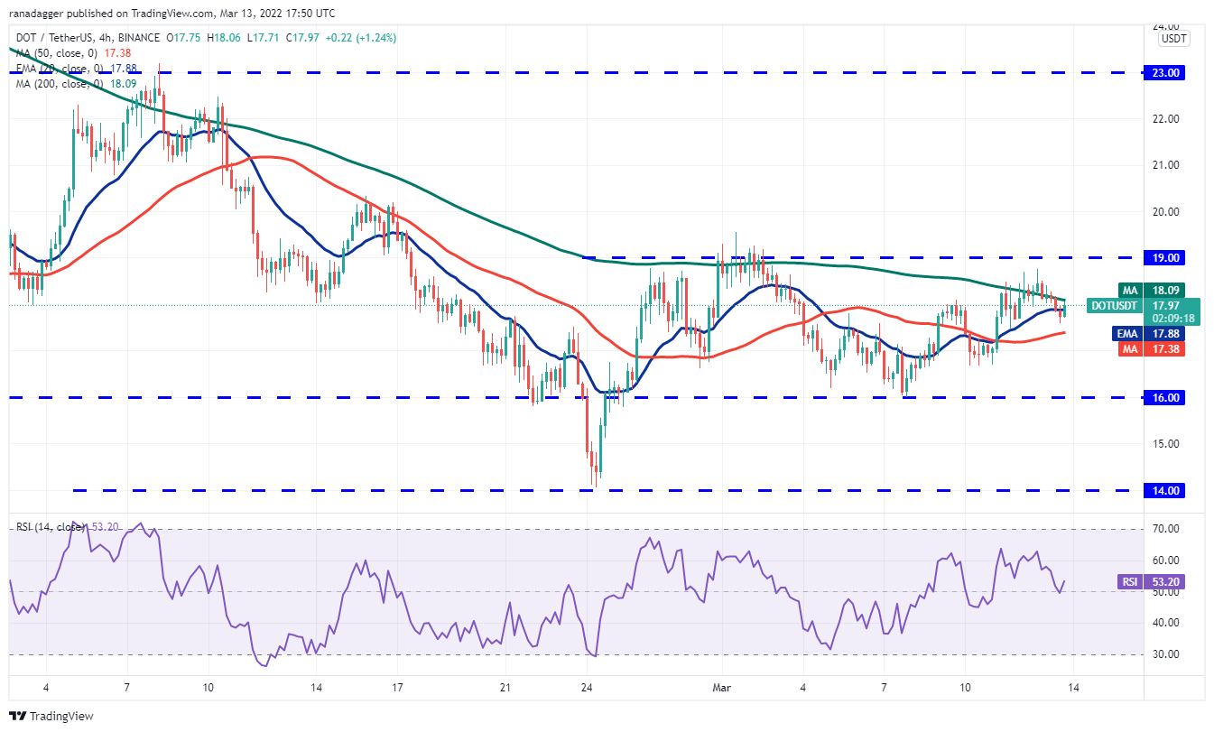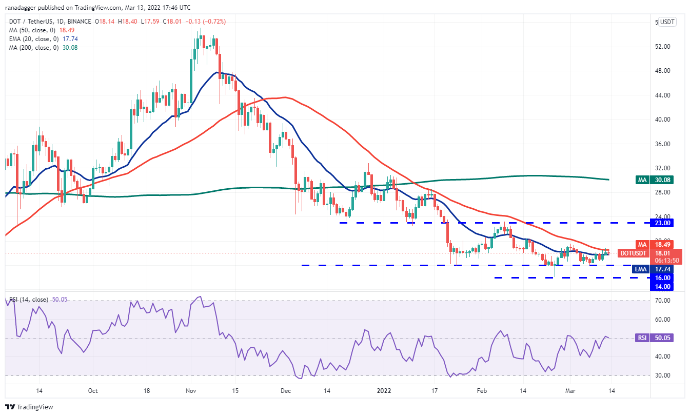 Тем не менее, позитивным признаком является то, что быки не потеряли много позиций после 50-дневной SMA. Это говорит о том, что трейдеры могут удерживать свои позиции, ожидая прорыва сопротивления. Если это произойдет, пара DOT/USDT может вырасти до верхнего уровня сопротивления на уровне 23 долларов, где медведи снова могут бросить вызов быкам.