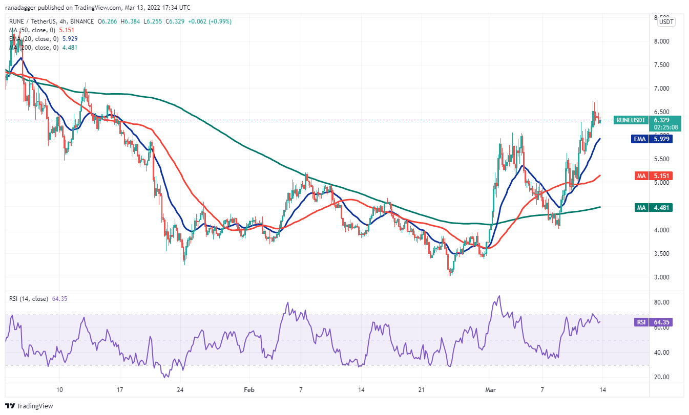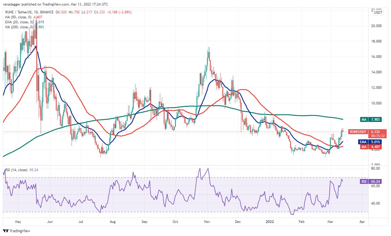 Быки теперь попытаются подтолкнуть цену к 200-дневной SMA на уровне 7,90 доллара, где медведи снова могут бросить им серьезный вызов. Если цена не отступит от 200-дневной SMA, быки предпримут еще одну попытку преодолеть это препятствие. Если им это удастся, пара RUNE/USDT может вырасти до 9 долларов.