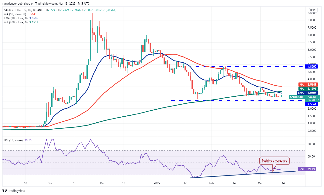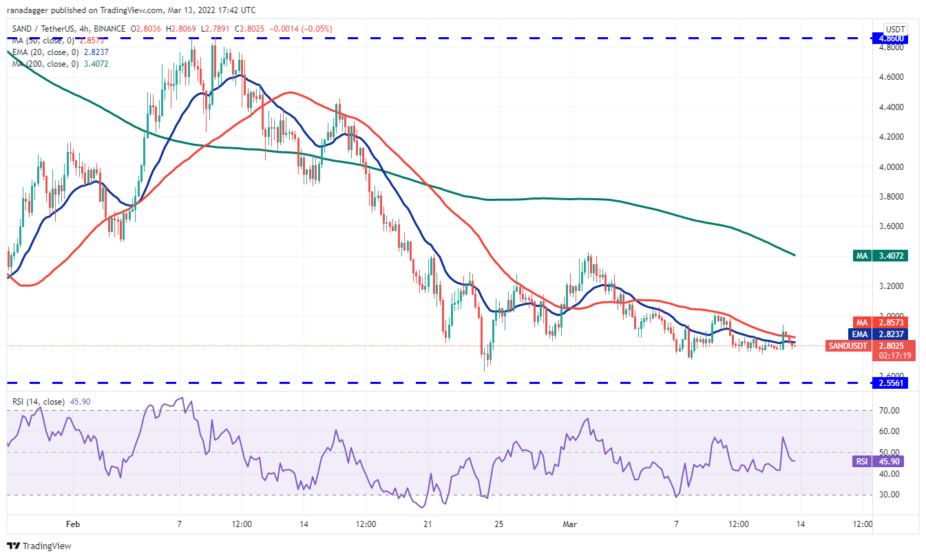 Цена The Sandbox (SAND) колебалась в диапазоне от 2,55 до 4,86 долларов в течение последних нескольких недель. 4 марта медведи опустили цену ниже 200-дневной SMA на уровне 3,15 доллара, но не смогли пробить поддержку на уровне 2,55 доллара.