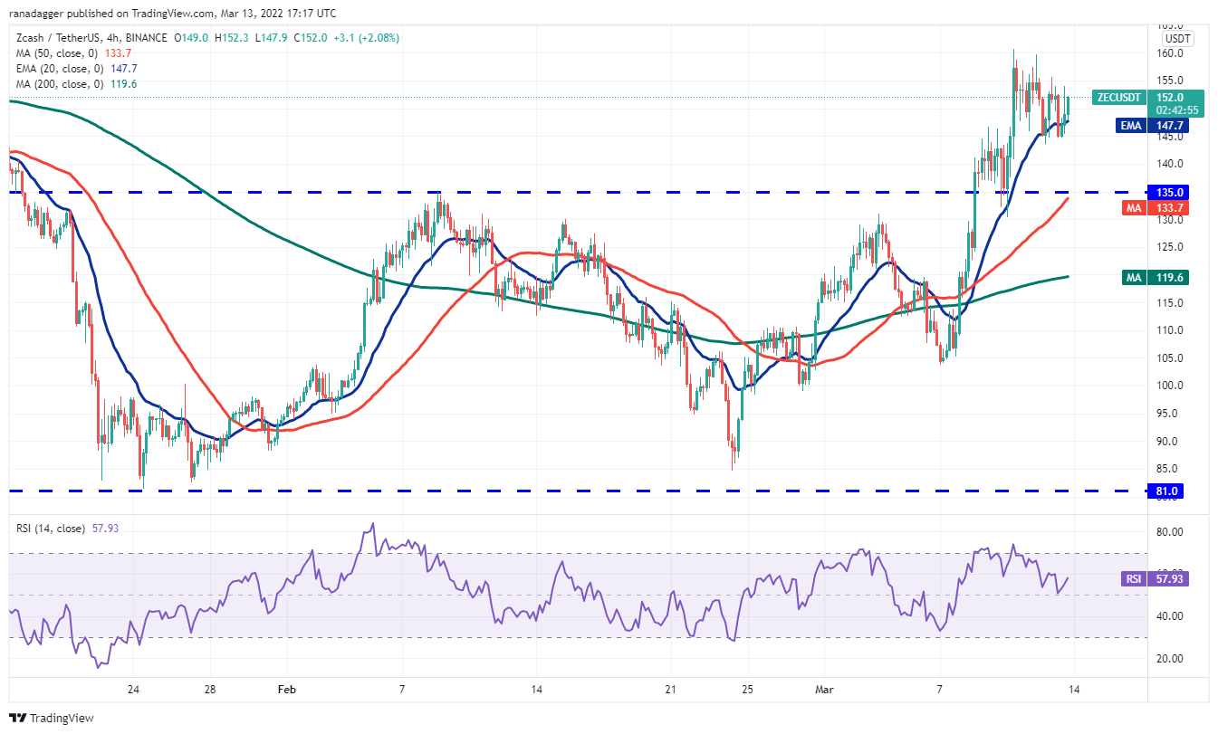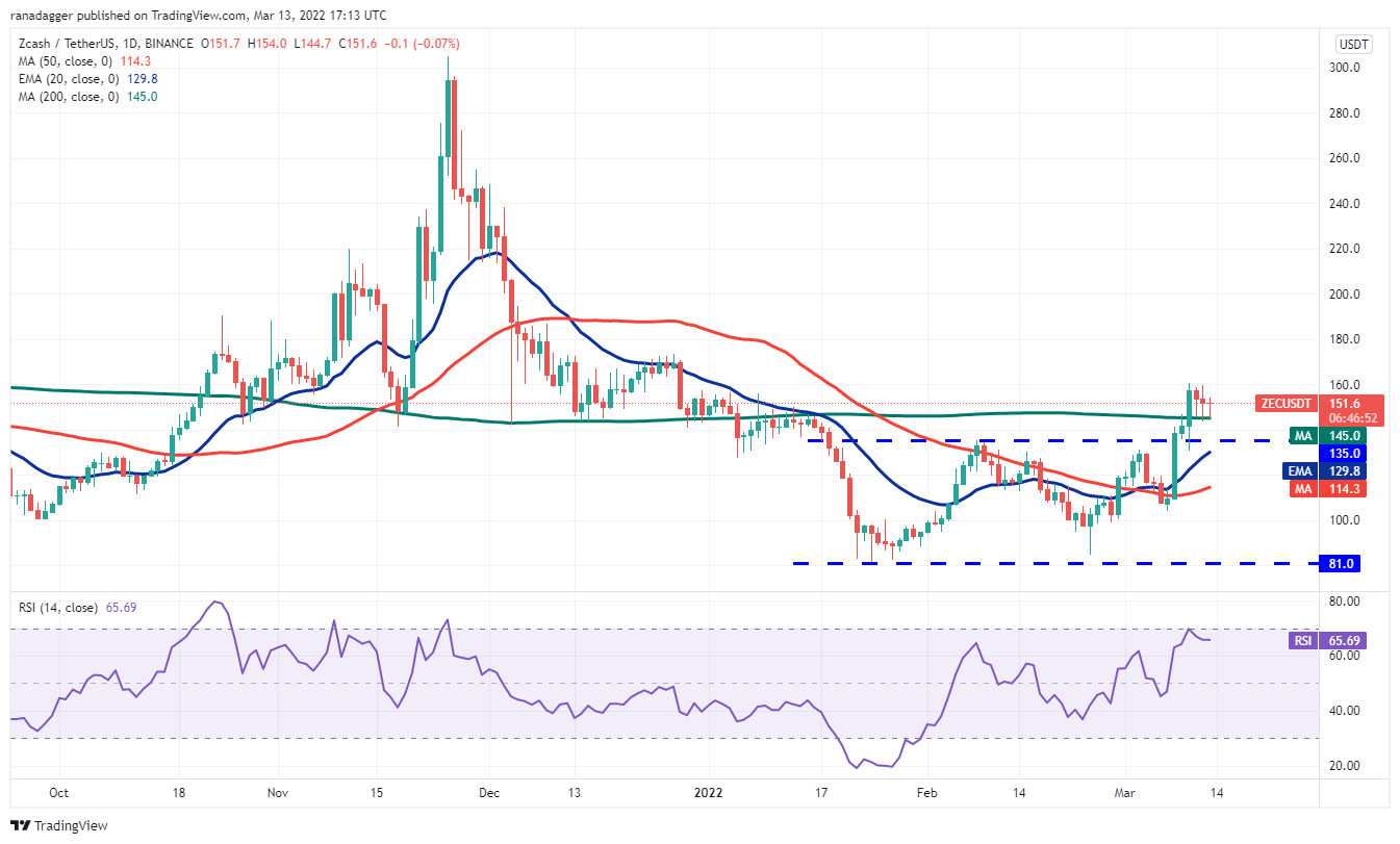 Zcash (ZEC) прорвался и закрылся выше сопротивления в 135 долларов 8 марта, что завершило фигуру двойного дна. За этим последовал прорыв выше 200-дневной SMA в 145 долларов 10 марта, что сигнализировало о том, что быки снова в игре.