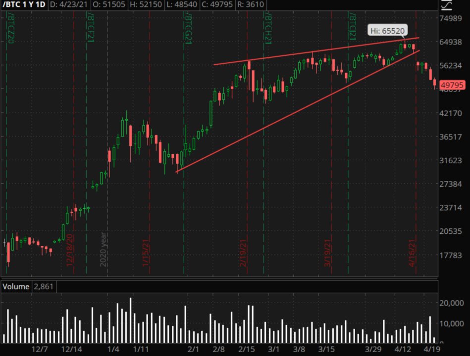 В своем сообщении на LinkedIn ведущий TD Ameritrade Оливер Реник пишет, что биткоин выдохся. Биткоин потерпел крах из-за своей массивной модели восходящего клина, которая формировалась с начала 2021 года.