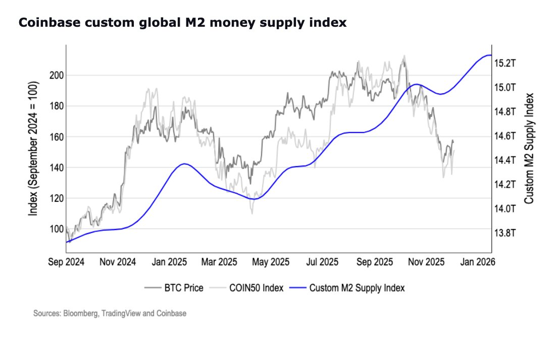 В октябре Coinbase прогнозировала ослабление крипторынка перед «декабрьским разворотом». Такой вывод был сделан на основе собственного индекса глобальной денежной массы M2, который отражает общий объем находящейся в обращении фиатной валюты.