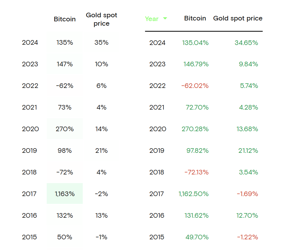 Биткоин показывал более высокую годовую доходность по сравнению с золотом большую часть своей истории, но 2025 год складывается иначе. Биткоин вырос более чем на 8% с начала года, в то время как спотовое золото подорожало на 57%. Источник: Curvo.
