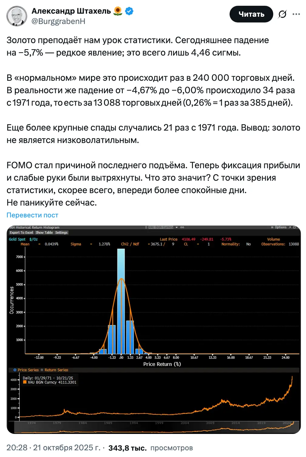 Масштаб коррекции крайне необычен. Теоретически подобное событие может происходить лишь «раз в 240 000 торговых дней», — отметил Александр Штахель, швейцарский инвестор в природные ресурсы, в своем посте на платформе X во вторник.