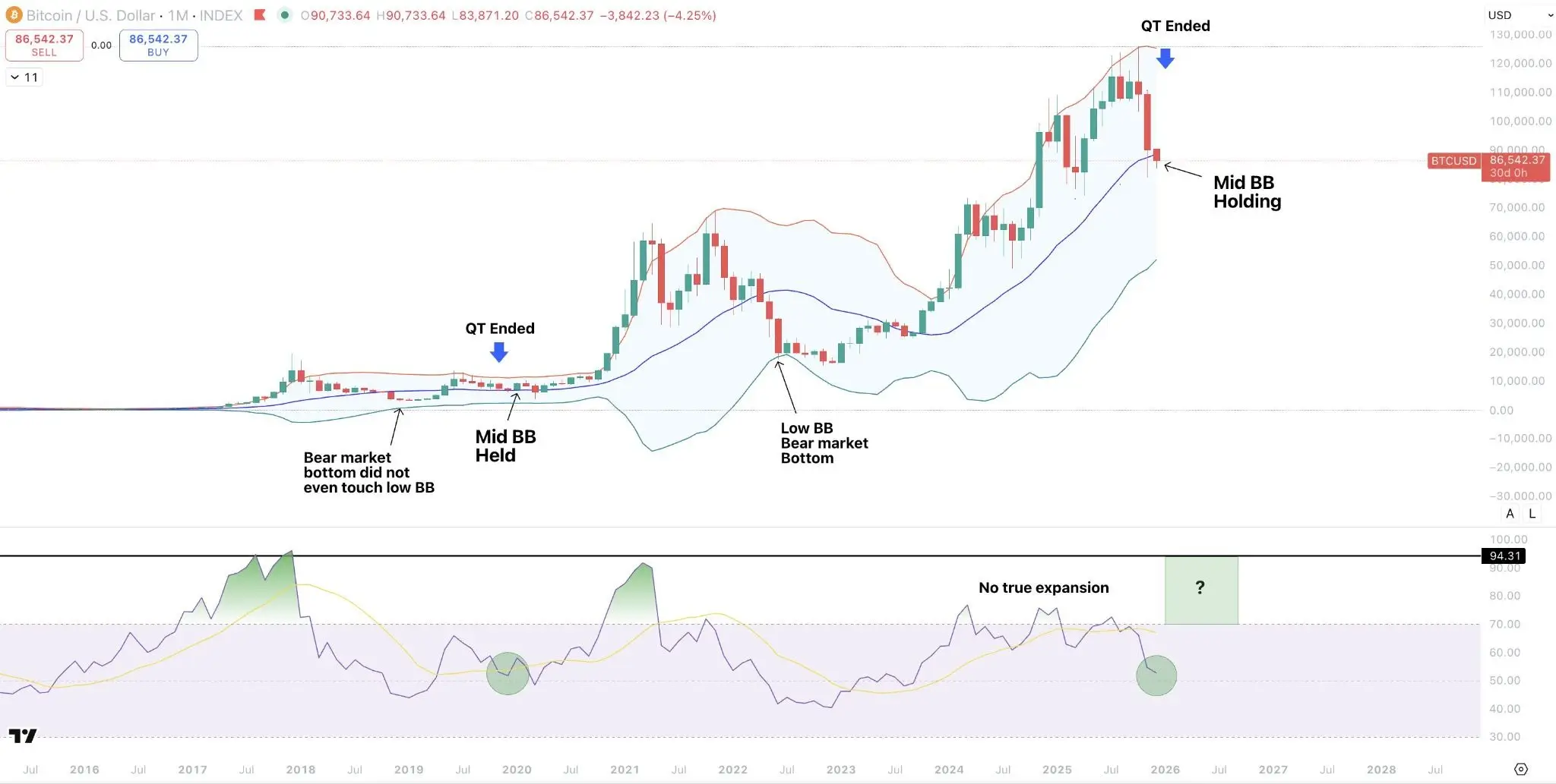 Он сравнил текущий цикл с 2017 годом, когда наблюдался значительный рост. Однако коррекция все же не вышла за нижнюю границу месячной полосы Боллинджера.