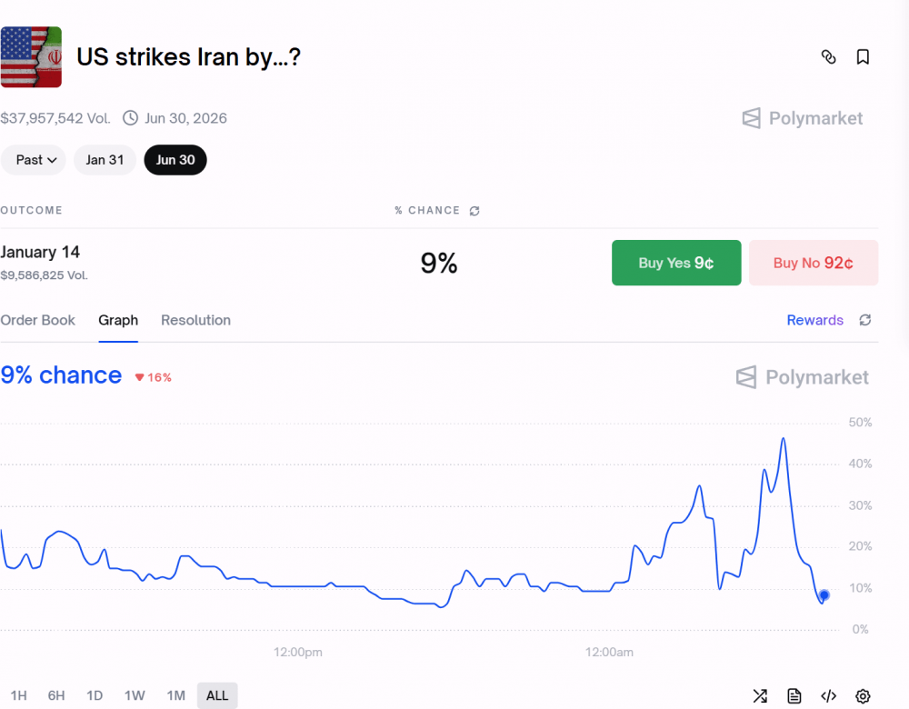 К позднему вечеру 14 января по времени США рынок давал 65% вероятности удара к концу месяца и 74% — к 30 июня.