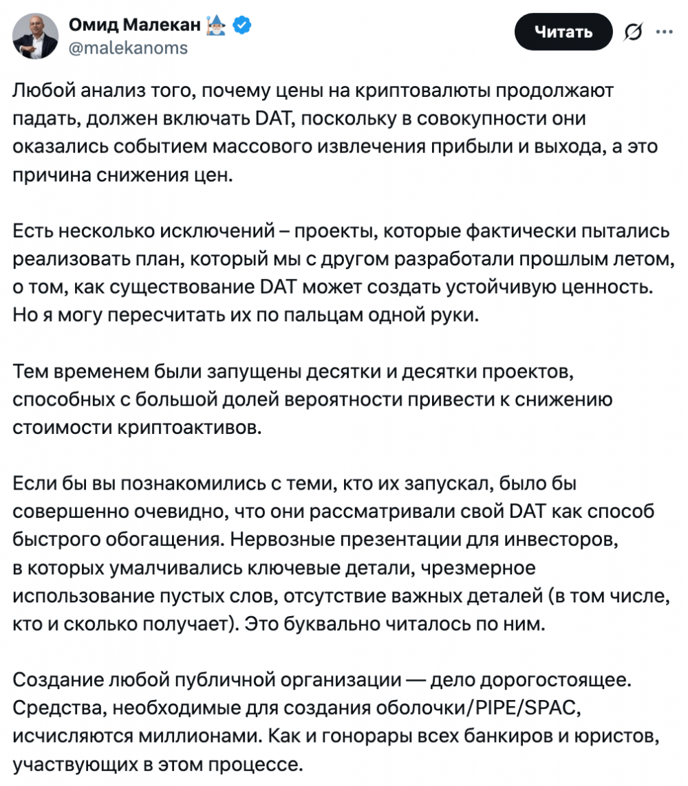 «Любой анализ причин продолжающегося падения цен на криптовалюты должен включать казначейские компании, работающие с цифровыми активами, — заявил Малекан в публикации в социальной сети X во вторник. — В совокупности они оказались инструментом массового изъятия средств и выхода с рынка, что стало причиной снижения цен».