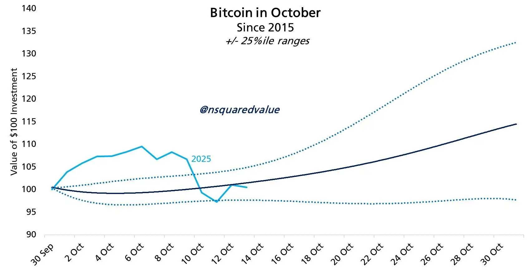 Октябрь получил прозвище «Uptober», поскольку биткоин демонстрировал рост в этом месяце в десять из последних двенадцати лет. В текущем октябре цена снизилась на 0,6% с начала месяца, но исторические тенденции указывают на возможность выхода в плюс к концу периода.
