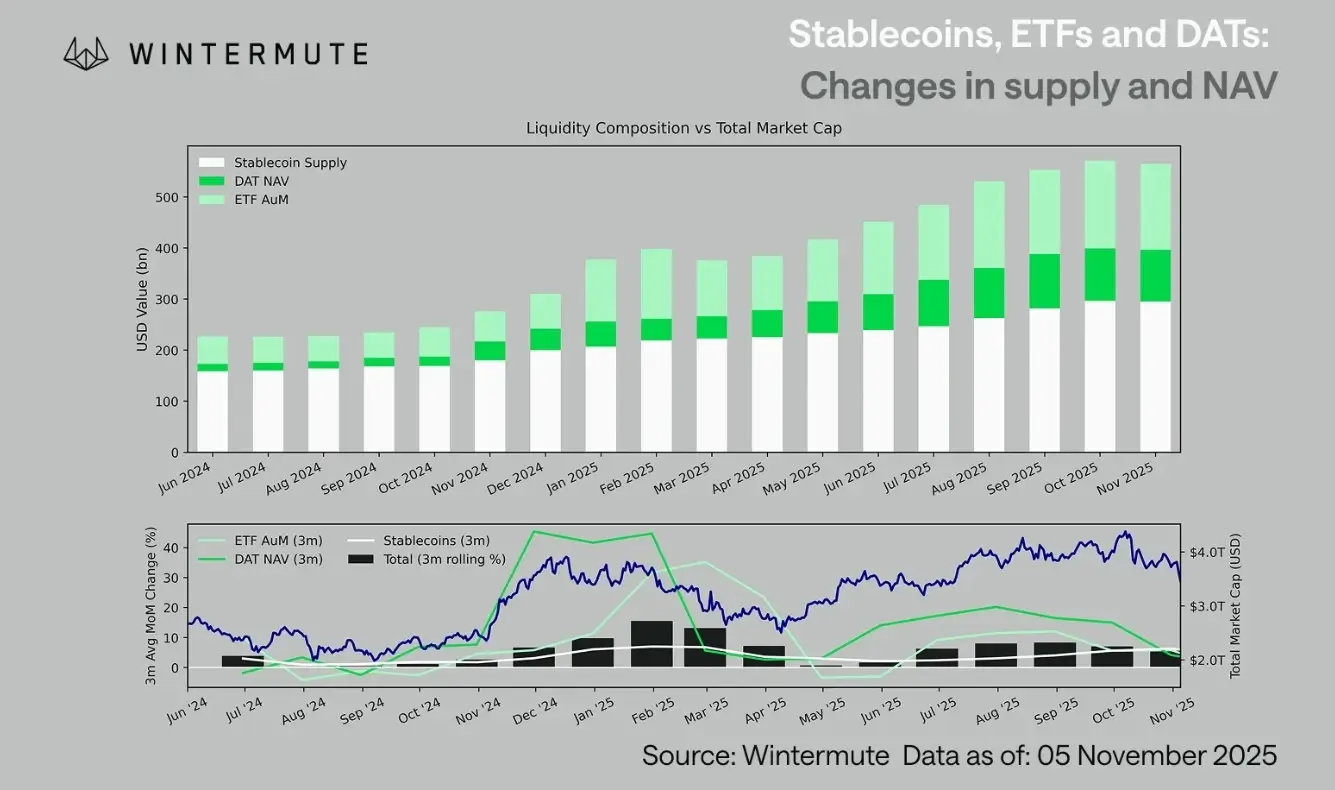 Компания указала на стейблкоины, биржевые фонды и корпоративные криптоказначейства как на три основных канала криптоликвидности. Wintermute предупредила, что приток ликвидности по всем трем направлениям достиг плато.